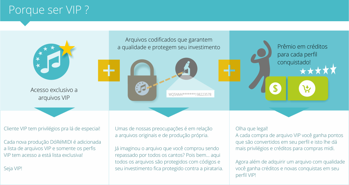 O sistema de cliente VIP foi criado com o intuito de reconhecer a preferência de nossos clientes junto ao nosso site e por isso, a cada conquista premiamos com créditos para compra de arquivos midi e liberamos os arquivos correspondentes a cada perfil, porém... para que suas conquistas não sejam em vão, é imprescindível que mantenha seus arquivos em lugar seguros. Todos os arquivos possuem chave de segurança vinculado ao seu pedido e código de cliente, a doação, troca ou venda destes arquivos a terceiros implica no rebaixamento e perda de seu perfil VIP e até o bloqueio de novos pedidos em nosso site. Esta regra é aplicada aos clientes com perfil Básico e perfil VIP. Proteja seu investimento e não permita a prática de pirataria. Os pedidos de solicitação para Perfil VIP será aceito somente após nossa análise e aprovação de nossa equipe. Temos como critérios de avaliação positiva perfis de clientes que possuem ligação direta com a música, clientes que não pertencem a grupos de venda ou troca de arquivos midi, que não possuem sites ou ferramentas para vendas de arquivos midi. |